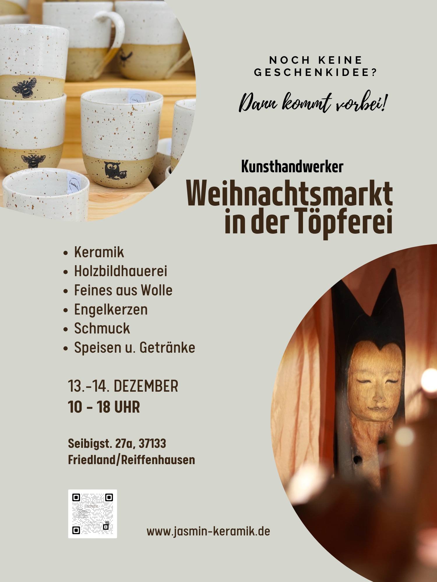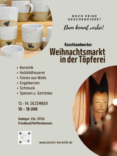 13.-14.12.2025 Weihnachtsmarkt in der Töpferei10:00 Uhr bis 18:00 UhrSeibigstr. 27a37133 Friedland / Reiffenhausen